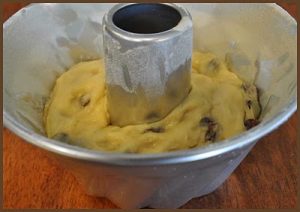 Umplem pe jumătate forma specială, care are o ridicătură la mijloc, pentru ca aluatul să facă o gaură. Nu uitați să ungeți în prealabil forma cu unt. Ținem la loc călduros.
