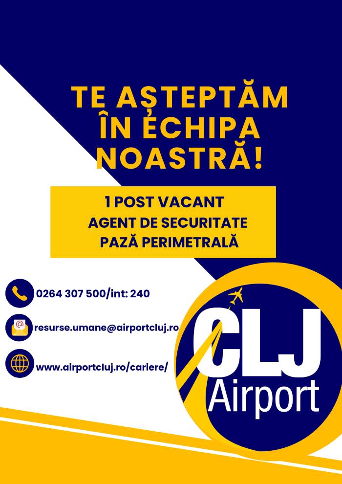 AEROPORTUL INTERNAȚIONAL AVRAM IANCU CLUJ R. A. organizează în data de 15.12.2025, ora 10:00, selecție pentru ocuparea următorului post vacant: